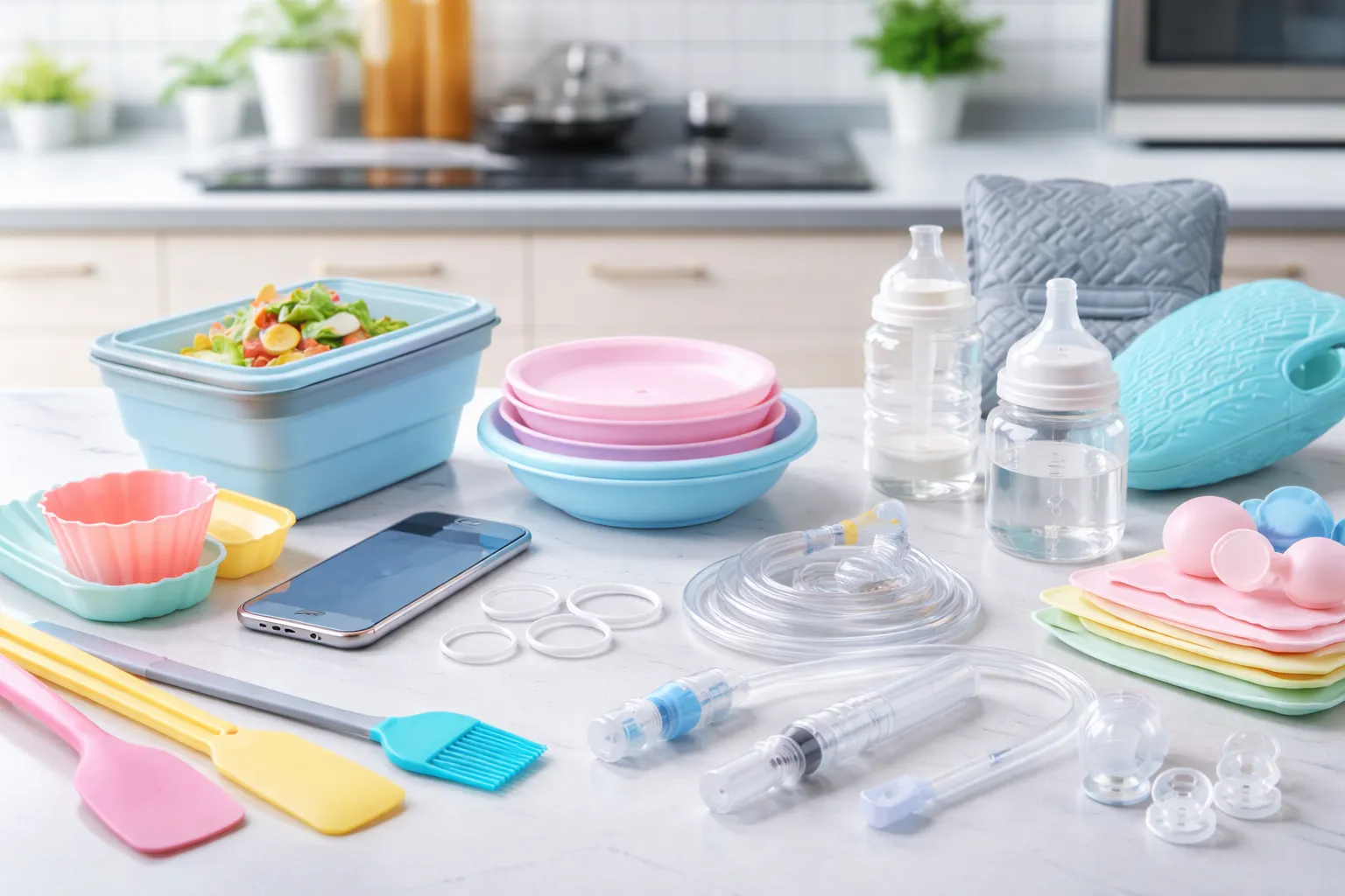 身近なシリコーン製品の代表例として、まずキッチン用品が挙げられます。シリコーン製の調理器具や保存容器、ゴムベラなどは耐熱性が高く、電子レンジやオーブンでも使用できるため、家庭で広く利用されています。また、スマートフォンケースや防水パッキンなどにもシリコーンは使用されており、柔軟性と耐久性を活かして精密機器を保護しています。さらに、医療分野ではチューブやパッキン、乳幼児向け製品(哺乳瓶の乳首など)にも採用されており、安全性と生体適合性の高さが評価されています。このようにシリコーンは、見えないところも含めて私たちの生活を支える重要な材料です。